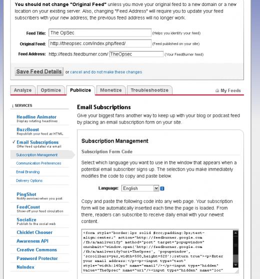 Hello, My new blog is up at http://www.TheOpSec.com, However I have quadruple checked my feedburner, and my e-mail & subscriptions are active! However anytime I click on 'subscribe', I get this: The feed does not have subscriptions by email enabled. Here is a screenshot of my settings: