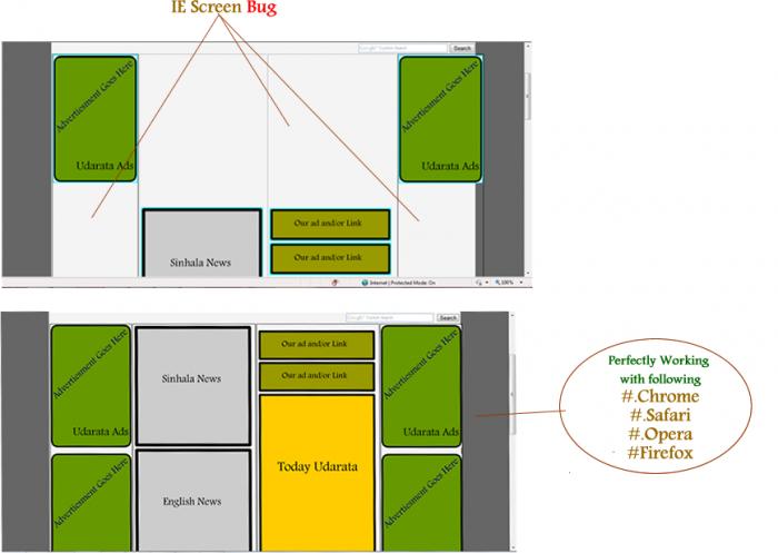 CSS codes are here- This is for whole site @charset "utf-8"; body { font-family:"Times New Roman", Times, serif; background-color:#666666; margin-bottom:0px; padding:2px; } div.wrapper{ margin-left:20px; margin-right:20px; width:1060px; background:#F4F4F4; } #top_nav{ padding-top:5px; padding-bottom:0px; } div.bodu_bag{ background:#CCCCCC; } a:link{ color:#00FFFF; } a:hover{ color:#00CC00; } a:visited{ color:#FFCC00; } #footer{ background:url(../images/footer.png) repeat-x; width:100%; height:50px; color:#FFFFFF; padding-top:40px; margin-bottom:0px; a:link{color:#00FF00}; } .top_menu{ text-align:right; margin-top:0px; margin-bottom:0px; margin-right:10px; } .top-image{ display:inline; width:30px; height:30px; margin-left:6px; margin-right:6px; margin-bottom:0px; margin-top:0px; } img.logo{ margin-top:0px; margin-bottom:0px; padding-top:20px; padding-left:10px; } .lang{ background:#FFFFFF; text-align:right; background-image:url(../images/lang_bg.png); margin-top:0px; background-position:center; padding-right:200px; background-repeat:repeat; height:60px; padding-top:60px; padding-right:10px; } marquee.marq{ border:solid; border-width:1px; border-bottom:none; color:#003300; } HTML: This is for the table (Bug area) td.ad_colm_left{ width:212px; border:#FF3300; border:solid; border-width:1px; height:auto;} div.search{ display:block; } td.ad_colm_right{ width:212px; border:#FF3300; border:solid; border-width:1px; height:auto; } #left_1{ text-align:center; height:303px; margin-bottom:1px; margin-top:0px; } #left_2{ text-align:center; height:303px; margin-bottom:1px; } #left_3{ text-align:center; height:303px; margin-bottom:1px; } #left_4{ text-align:center; height:303px; margin-bottom:1px; } #right_1{ text-align:center; height:303px; margin-bottom:1px; margin-top:1px; } #right_2{ text-align:center; height:303px; margin-bottom:1px; } #right_3{ text-align:center; height:303px; margin-bottom:1px; } #right_4{ text-align:center; height:303px; margin-bottom:1px; } td.main{ width:600px; height:auto; } table.table_bd{ border:none; height:auto; margin-bottom:2px; } td.lb{ width:300px; height:auto; } td.rb{ width:300px; height:auto; } td.a{ text-align:left; width:290px; height:300px; border:none; margin-bottom:0px; margin-right:0px; text-align:center; } td.b{ margin:0px; text-align:left; width:300px; height:300px; border:none; margin-top:0px; margin-left:0px; text-align:center; } td.c{ margin:0px; text-align:left; width:300px; height:70px; border:none; text-align:center; } td.d{ margin:0px; text-align:left; width:300px; height:300px; border:none; text-align:center; } td.g{ text-align:left; width:300px; height:50px; margin:0px; border:none; text-align:center; } td.h{ text-align:left; width:300px; height:50px; margin:0px; border:none; text-align:center; } td.j{ text-align:left; width:300px; height:50px; margin:0px; text-align:center; } td.k{ text-align:left; width:300px; height:50px; margin:0px; text-align:center; } td.l{ text-align:left; width:300px; height:50px; margin:0px; text-align:center; } td.i{ text-align:left; width:300px; height:400px; margin:0px; text-align:center; } td.m{ text-align:left; width:150px; height:50px; margin:0px; text-align:center; } td.n{ text-align:left; width:150px; height:50px; margin:0px; text-align:center; } td.o{ text-align:left; width:150px; height:50px; margin:0px; text-align:center; } td.p{ text-align:left; width:150px; height:50px; margin:0px; text-align:center; } td.q{ text-align:left; width:300px; height:50px; margin:0px; text-align:center; } td.e{ text-align:left; width:400px; height:50px; margin:0px; text-align:center; } td.r{ text-align:left; width:200px; height:50px; margin:0px; text-align:center; } td.f{ text-align:left; width:100px; height:50px; margin:0px; text-align:center; } td.s{ text-align:left; width:500px; height:50px; margin:0px; text-align:center; } td.v{ text-align:left; width:600px; height:50px; margin:0px; text-align:center; } td.w{ text-align:left; width:600px; height:50px; margin:0px; text-align:center; } td.y{ text-align:left; width:300px; height:50px; margin:0px; text-align:center; } td.z{ text-align:left; width:300px; height:25px; margin:0px; text-align:center; } td.t{ text-align:left; width:600px; height:125px; margin:0px; text-align:center; } td.x{ text-align:left; width:300px; height:50px; margin:0px; text-align:center; } HTML: