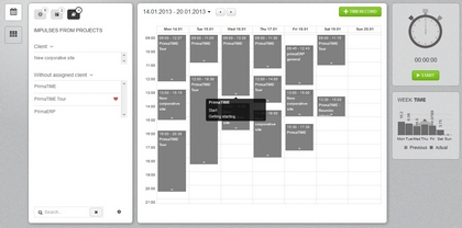 Free time tracking software with all features for 1 - 3 users - no trial period. primaERP / TIME TRACKING is a cloud based application which allows you to track and evaluate your time. Application automatically generates reports of the tracked time, that can be used for billing your clients. Reports allow you to evaluate the efficiency ofeach of your tasks or projects and provide you all the information needed for making the right decisions in order to increase productivity. You can collaborate with your team on the projects, delegate tasks and get the instant answer to the question „What the hell is my team doing“. App is connected to external applications such as Basecamp, MS Exchange calendar and Google Calendar. It has an open API, that allows you to easily connect your favourite project management tool or any other software of your choice. It is a very useful app for both personal and business use, especially intended for entrepreneurs, managers, self-employed, business and productivity consultants, freelancers and others, who want to know, where do they invest their time.