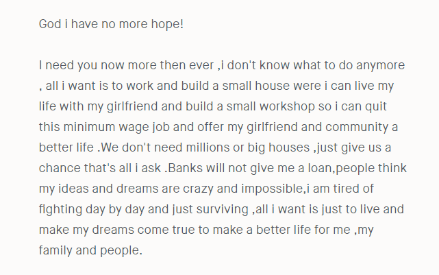 You're the one that made that page. Look how you wrote your sentence here: What a maggot ,he should do us a favor and kill him self . The comma and period have a space in front of them, which is kind of unusual. It's written the same way on the page you created: I need you now more then ever ,i don't know what to do anymore , all i want is to work and build a small house were i can live my life with my girlfriend and build a small workshop so i can quit this minimum wage job and offer my girlfriend and community a better life . The questions I have are why do you call yourself a maggot? Why do you wish a bodily harm upon yourself? But most importantly, why are you using the name of God to manipulate people to give you $$?