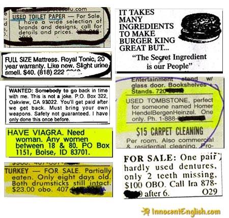 heres some more: how do i enlarge the image inside the thread? 2 female Boston Terrier puppies, 7 wks old, Perfect markings, 555-1234. Leave mess. Lost: small apricot poodle. Reward. Neutered. Like one of the family. A superb and inexpensive restaurant. Fine food expertly served by waitresses in appetizing forms. Dinner Special — Turkey $2.35; Chicken or Beef $2.25; Children $2.00. For sale: an antique desk suitable for lady with thick legs and large drawers. Four-poster bed, 101 years old. Perfect for antique lover. Now is your chance to have your ears pierced and get an extra pair to take home, too. Wanted: 50 girls for stripping machine operators in factory. Wanted: Unmarried girls to pick fresh fruit and produce at night. We do not tear your clothing with machinery. We do it carefully by hand. For Sale. Three canaries of undermined sex. For Sale — Eight puppies from a German Shepperd and an Alaskan Hussy. Great Dames for sale. Have several very old dresses from grandmother in beautiful condition. Tired of cleaning yourself? Let me do it. Dog for sale: eats anything and is fond of children. Vacation Special: have your home exterminated. If you think you’ve seen everything in Paris, visit the Pere Lachasis Cemetery. It boasts such immortals as Moliere, Jean de la Fontain, and Chopin. Mt. Kilimanjaro, the breathtaking backdrop for the Serena Lodge. Swim in the lovely pool while you drink it all in. The hotel has bowling alleys, tennis courts, comfortable beds, and other athletic facilities. Get rid of aunts: Zap does the job in 24 hours. Toaster: A gift that every member of the family appreciates. Automatically burns toast. Sheer stockings. Designed for fancy dress, but so serviceable that lots of women wear nothing else.