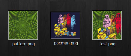 I think you had too much transparency stuff going on. This worked out for me. <?php $src = imagecreatefrompng('pacman.png'); $color = imagecolorclosest($src, 27, 26, 55); imagecolortransparent($src, $color); imagealphablending($src, true); imagesavealpha($src, true); $texture = imagecreatefrompng('pattern.png'); $new = imagecreatetruecolor(460, 460); imagecopy($new, $texture, 0, 0, 0, 0, 460, 460); imagecopymerge($new, $src, 0, 0, 0, 0, 460, 460, 100); imagepng($new, 'test.png'); imagedestroy($new); imagedestroy($src); imagedestroy($texture); ?> PHP: