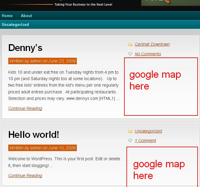 Hey all! I'm hoping there is a Wordpress Ninja out there who might know how to help me out. Long story short - I have a blog about restaurants, and I'd like to show a Google map of the restaurants location on the front page. Getting the map to appear inside the post is easy...but I was hoping someone would know how to tell the theme to show the iframe Google map for the front page of the blog for each post. Here is a screenshot of what I'm talking about. The theme uses custom fields, so I'm thinking this shouldn't be too hard? If anyone could help, you might just make dreams come true Thanks!!!