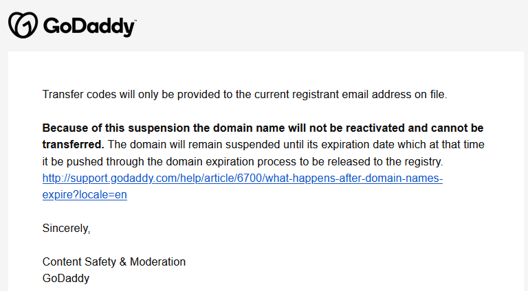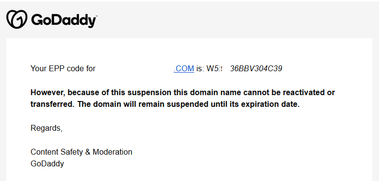 Godaddy suspends my old domain and refuses to give me the authorization code