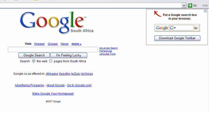 I don't know if any of you guys noticed this, but I used IE (first time in a looong time) to quickly check something out at Google. When the main Google page loaded I was greeted with a little ad promoting their toolbar. I'm so used to just the plain search box only page that this seemed quite weird. That goes to show how used to a non ad plastered page you get. Now they have the fullest right to promote their products, but there are bound to be people moaning about this (like they did with Google promoting their own products and services on certain search terms).