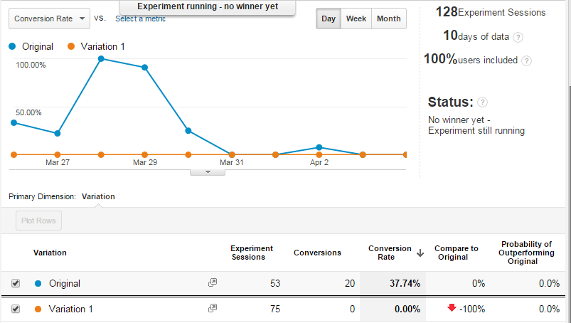 Hi, Please look at Image 4 -- the experiment sessions to both the original and the variation 1 are clearly shown as 53 and 77 respectively. The other metrics such as pages/sessions avg. session duration bounce rate and % new sessions are also shown. But in Image 2 no Goal Conversions. Thanks