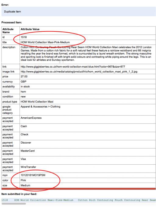 Hi. My google base account says 1932 of 3365 items inserted and 1433 have not been inserted because they are duplicates. I have gone through the duplicate items and they all have different and unique ID's, titles, sizes and mpn reference. Below are examples of two different items that Google are saying are duplicate and I can not understand why. Can any one advise or assist please?
