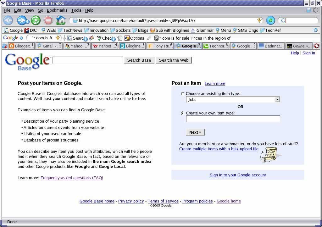 Some interesting links for people that haven't heard yet that Google may be launching something "Craig's List like". http://www.flickr.com/photos/dirson/55908013/ http://www.seroundtable.com/archives/002705.html http://www.seweso.com/blog/google-base2.png I've seen rumors they might be taking on eBay as well with auction style listings.