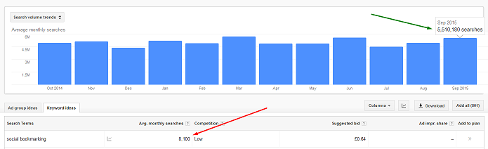 The 5 million figure is all the "keyword ideas" combined, not just "social bookmarking". Social Bookmarking alone is 8,100 monthly.