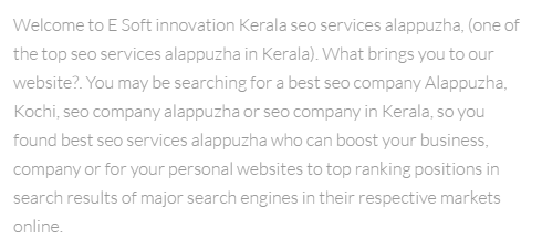 I'd actually be offended by http://www.teczeesystems.com/ ranking higher than you These guys look good http://www.cijocyril.com/website-design-alappuzha.php but seriously, who sells a customer a website with 4 pages? Should be unlimited because you've given them a cms. And what's with the "once upon a time on a rainy day" phrase under their logo lol, I thought http://www.ratchet.co.in/ looked good until I saw the keyword stuffing in their meta, I wouldn't trust them as far as I could throw them and that brings us to your site... oh dear. Write for the reader, not the search engine If you are the "best seo services" in alappuzha (no capital A?) then the rest must be awful. You need to start from scratch. Google will know where your business is because you'll have the address in the footer, linked in Google Places etc. You can probably go easy on the actual content and rest assured that they know where you are. A bit more contrast in your text colour wouldn't hurt either. It's hard to read and you don't want Google thinking you're hiding text - especially when you've keyword stuffed it too!
