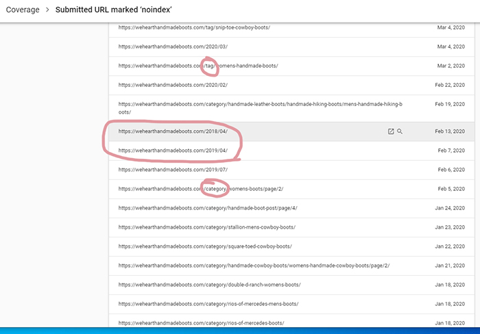 I'm trying to figure out all these errors I'm getting in Google Search Console (95). I have attached a couple screen shots. 1 is the errors and I circle a couple. Ones like this: https://wehearthandmadeboots.com/2020/03/ have me worried because those aren't a tag or category (Wordpress) so I'm not really sure why it's getting a No Index error. The 2nd screen shot are my setting in All In One SEO in Wordpress for the NOINDEX Settings. Can anyone see what I might have wrong here? I would make sure the tag and categories wold get followed, but I don't want to get hit with duplicate content. Should I not be worried about this or anything else that you can see? Any help would be GREATLY appreciated! Thanks