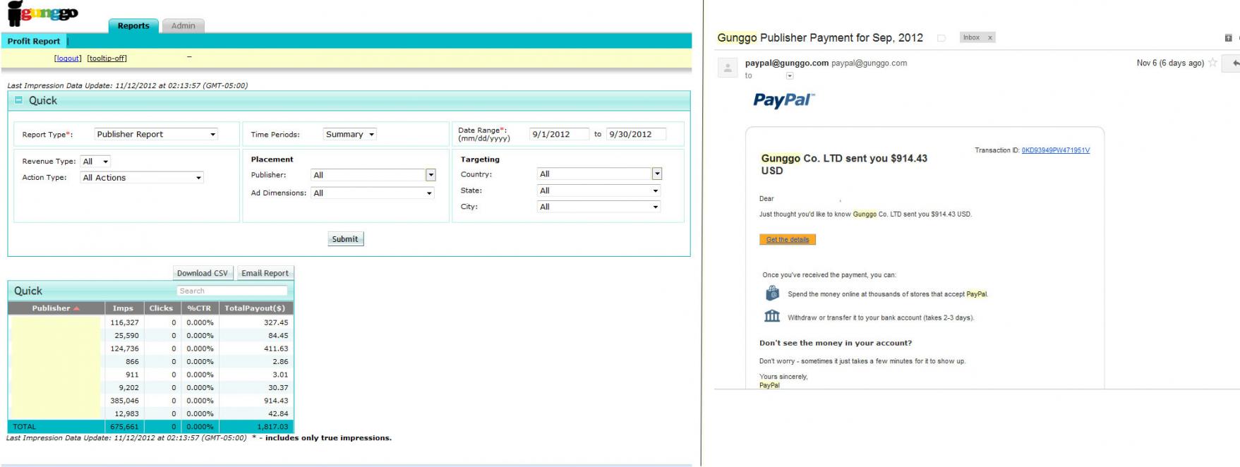 Hello, I want to report my experience with Gunggo. I was talking with a guy named Daniel and we agreed to sell him traffic for popunders. We worked great for two months and all payments were correct. Aftrer they earned our trust we gave them more publishers. The third month we noticed that they started tamper with the agreed rates. We had agreed at $3.3 CPM and as you will notice from the screenshot the rate is at $2.7. We tried contacting them about the rates but they were ignoring our emails or giving some weired excuses. Nevertheless, they also had the nerve to send the half money. Gunggo phones no matter what time you call is always in voice machine, their accounting is never responding and the guy named Daniel simply dissapeared or on some occasions give some lame excuse. Before that he was replying the same day. We have kept all emails and discussions and can be published for anyone who disbeliefs or rushes to support them. We have removed all popunders now and as far concering us we consider Gunggo a scam network and we decided to go legal on that and also issue a complaint on Internet Crime Schemes for online fraud - we will also try to notify all their advertisers in order to protect future publishers from loosing money.