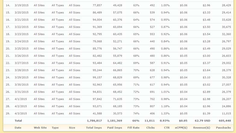 Hello everyone, We came across here while we were checking out the comments on our platform. It is appropriate to respond these queries, as we have modified our platform recently. We would like to clarify the issues addressed here; (i)According to the shared stats, it would be more suitable to use eCPM instead of CPM, as campaigns are not only CPM ones, they also include CPC and CPA)campaigns as well. Therefore, it is better to put eCPM as average 1000 impression revenue. (ii)Website revenues depend on many variables such as the number of banners per page, location of the banners, country, user device types (mobile/desktop), conversion rates (for CPA campaigns), referring domain names brand safety (for premium CPM campaigns), daily unique number of visitors, etc. (iii)We developed a system for partners who wish to take part in CPM-only campaigns (campaigns which pay per impression) with floor CPM price and passback banner-type option. This option is only available for websites which have brand-safe content and domain. This floor-CPM model guarantees website owners their revenues for each 1000 impressions up to 40% fill rate. Best Regards H12 Business Development Team