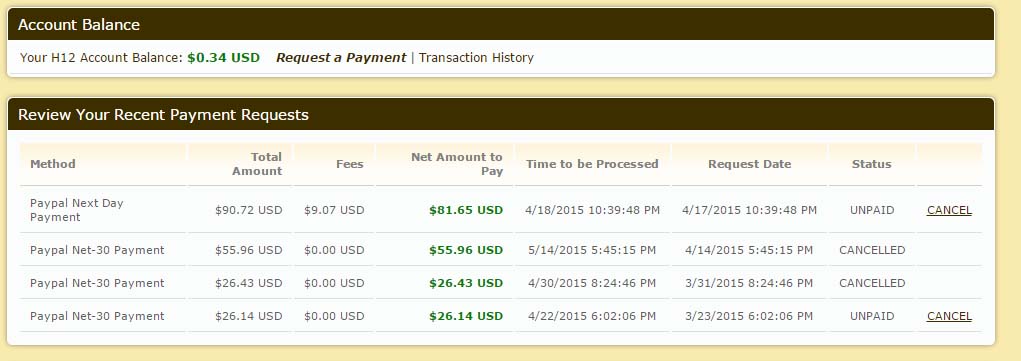 I had selected next day payment but unfortunately my payment is still pending at h12 media I have already leave them due to low cpm rates in the begining they are paying me 0.07$ cpm but slow and studly they decreased cpm which was at the end 0.02 cpm. But now I am here for my payment