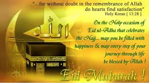 Asslam.o.Alaikum To All Muslim's .. I am wishing it to all Muslims, May this Eid bring lot of Happiness. Islam celebrates this great festival, It is neither blood nor their meat that reaches ALLAH but it's piety from you that reaches him, You can find further info here http://islam.about.com/od/hajj/a/adha.htm Well that is really my great pleasure to wishing you all Happy Eid_u_l Azha Mubarik .. Kind Regards