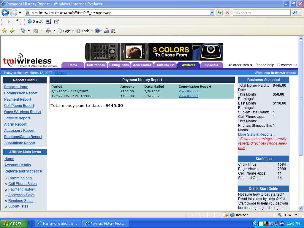 Total Money Paid to Date: $445.00 This Month Earnings¹: $50.00 Last Month Earnings¹: $110.00 Sub-affiliate Count: 1 Cell Phone apps This Month: 1 Phones Shipped this Month: 1 Your Affiliate ID: 12245 Your Website Link: tmiwireless com/?aid=12245 Your Link to Recruit Affiliates: tmiwireless.com/affiliate/?aid=12245 Total Unique Click-thrus: 1583 Total Pages Viewed: 2988 I dont want this to be spam just wanted to post an update. For a 4 month old affiliate I think the earnings are good since there is not site maintainence. Returns per click are very good. Like I said please dont ban me I just wanted to provide input to anyone else who might be looking to use their domain name for an affiliate program. I point 2 domains to the page via forward and basic SE submission.