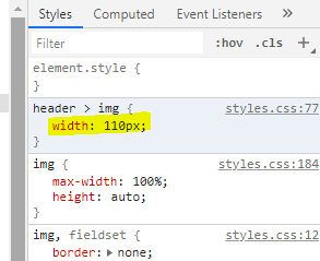 If it worked, and most part of your external css Worked, then you are loading the css file properly. The issue is most likely precedence. Meaning that a different rule might be overriding header > img. For example, on line 65, width is set to 180px. Try putting !important after your css rule. For example: header > img{ width: 150px !important; } Code (CSS): That should work if your issue is precedence. Don't forget to remove the <style></style> tags in your html so you won't get false result Also, to avoid the cache issue, if you use Chrome, you can also try this: Press Ctrl+Shift+J in Chrome Go to the Network Tab Click on "Disable Cache" This should prevent Chrome from Caching your files