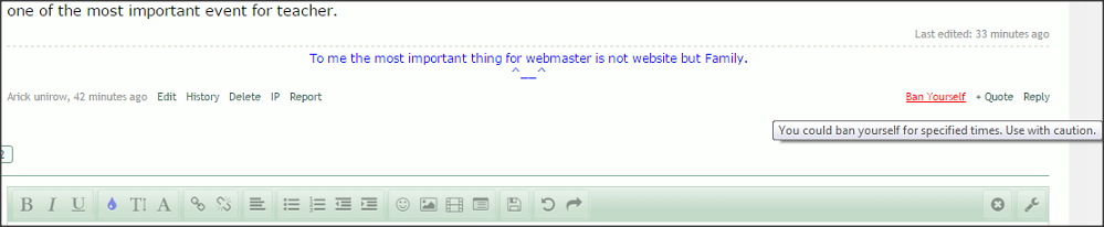 For anyone who prefer some vacations, there is actually a new beta feature to ban ourselves. A red text menu with a tool-tip "Use with caution". The menu is available upon request. Use it and a new text title would appear below your name: "The user couldn't wait mods to ban him so he ban himself" and sometimes it display "The user accidentally banned himself after pressing wrong button". I like this new feature. It should be available for anyone.