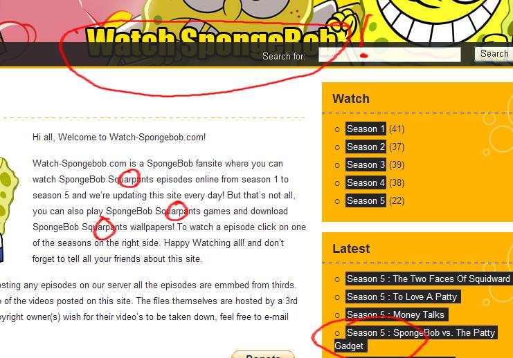 Hi, Nice site. Jolly, nice colors. A couple of things - see attached. Should the site name be behind the search bar? It's squarepants I believe. Good luck, Mike