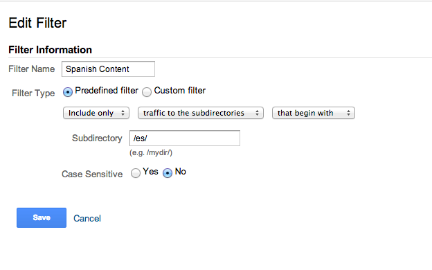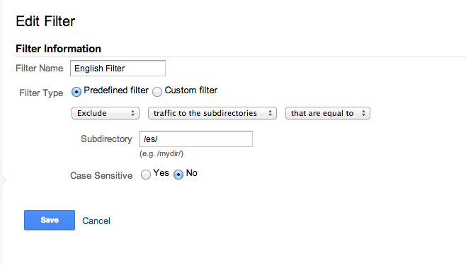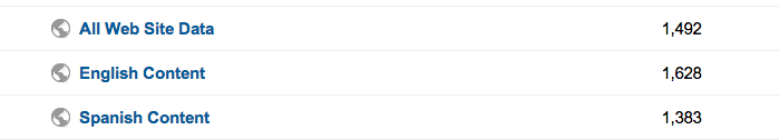 We have a bilingual site that hosts content in both English and Spanish. I've set up three profiles within our account, one to track all visits to the site, one to track visits to English pages and one to track visits with Spanish pages. (see screenshot profiles.png) On the "All website data" profile there are no filters. On the "English content" profile I've set up a filter to exclude all content to the "/es" directory (see screenshot english-filter.png). On the "Spanish Content" profile I've set up a filter to only include content in the "/es" directory (see screenshot spanish-filter.png). I've been over the settings a million times and everything seems OK to me. Yet somehow the "English Content" profile is getting more visits than the "All website data" profile, which doesn't make sense. And shouldn't the number of visits to the "English Content" and "Spanish Content" profiles combined equal the number of visits to the "All website data" profile? (see screenshot profiles.png). Have I set something up incorrectly, or am I thinking about it wrong? I've attached screenshots to make my question clearer. Would greatly appreciate feedback. Thanks!
