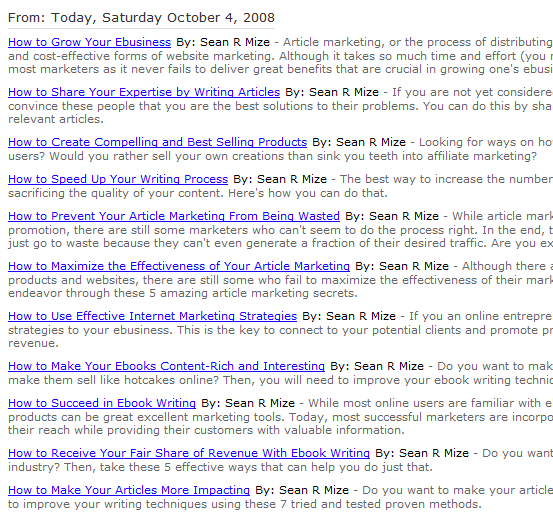 Take a look at this screen shot, I just took 5 minutes ago Oct,4 I've never once had my articles featured on the first page let alone 16 of them at once (I wasn't able to capture all of them). I know ezine articles always sends you an email after they accept your content, saying "your article will be displayed on our home page later today!" But I've never, ever seen it happen once, so how the hell does this guy get 16 of them all to show up at once? He must be really sucking up the PR...huh? I want in.....lol So I can do it too!