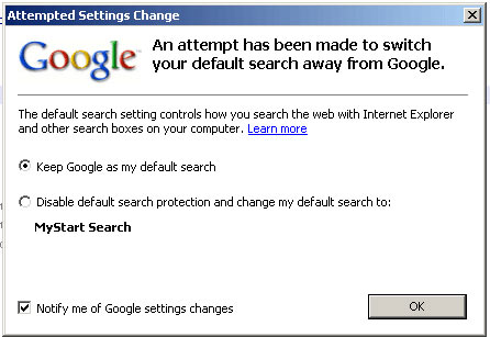 Yeah , google begun to protect their search clients... this can be considered anti-trust because they begun to just block others programs that want to change a person default search engine from browser... anyway their initiative it's somehow good, because they are protecting us from those $$$ PPC ads and others spyware that's eating all your CPU and freeze your computer.