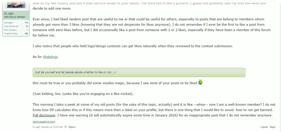 Ever since, I had liked random post that are useful to me or that could be useful for others, especially to posts that are belong to members whom already got more than 3 likes (knowing that they are not desperate for likes anymore). I do not remember if I ever be the first to like a post from someone with zero likes before, but I did occasionally like a post from someone with 1 or 2 likes, especially if they have been a member of this forum far before me.