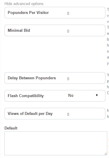Popunder per visitor= 3 Minimal bid= 0.001 Delay Between Popunders= 180 Views of Default per Day= 3 Default: you can use this setting to load alternative ad networks. for example: you can signup on popcah.net & copy their code...