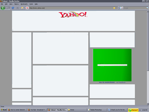 I thank you for the time and effort you are putting into this. I don't think I am communicating myself clearly enough. I attached an image of what yahoo.com looks like on my 20-inch monitor. This is what I am trying to achieve. (Sorry the image is so tiny. This site for some unknown reason won't let me attach a larger image.) All the elements at yahoo are grouped into squares next to each other side by side and vertically with 10 or 20 grey pixel gaps between them. Then on both the right and left side near the edge of my browser window, running vertically is 1-inch wide empty space. It is as though yahoo designed their site assuming the average user has a 19-inch monitor and for those of us with larger or wider monitors, yahoo insured their web page would load with all the elements grouped together at the center of the browser window. Msn.com, youtube and myspace each have 1-inch of space on both sides of their content showing on my monitor no different from yahoo.