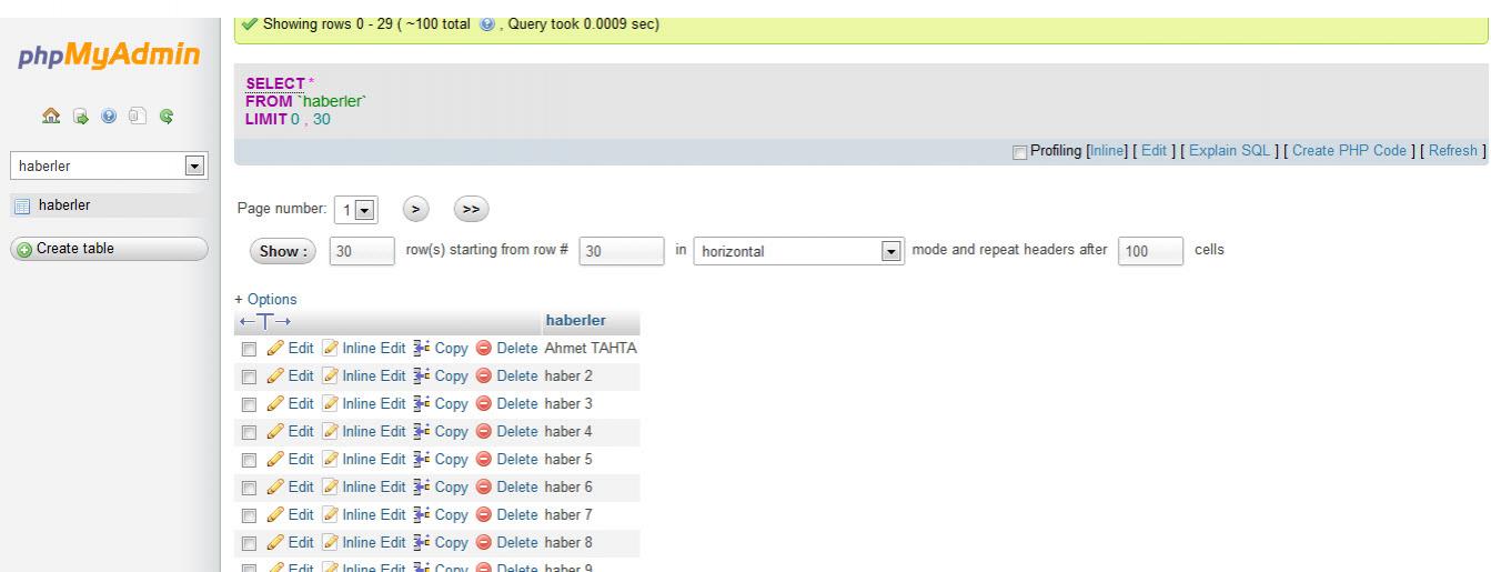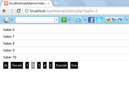 1-this ↑ my pagination screenshot,i want to insert into rows apage.php for example, instead of the value haber 2, haber 3 ... 2-and this ↑ is phpmyadmin table screenshot, how can i insert a specific php pages into these values, and paginate with below codes 3- <?phpmysql_select_db('haberler' ,mysql_connect('localhost','root','')) or die(mysql_error());$page= (!isset($_REQUEST['page']) || !ctype_digit($_REQUEST['page'])) ? 0 : $_REQUEST['page']; if(!$page) $page = 1;$total = mysql_num_rows(mysql_query("select * from haberler"));$limit = 5;$show = $page * $limit - $limit; $query = mysql_query("select * from haberler limit $show,$limit"); while($row = mysql_fetch_array($query)) { echo '<span class="haber">'.$row['haberler'].'</span>'; }$page_last = ceil($total/$limit);$forlimit = 3; echo '<div class="sayfala">'; if($page > 1){ $previous = $page -1; echo '<a class="sayfa" href="index.php">First</a><a class="sayfa" href="index.php?page='.$Previous.'">Previous</a>'; } for($i = $page - $forlimit; $i < $page + $forlimit +1; $i++){ if($i > 0 && $i <= $page_last){ if($i == $page){ echo '<span class="aktif">'.$i.'</span>'; }else{ echo '<a class="sayfa" href="index.php?page='.$i.'">'.$i.'</a>'; } } } if($page != $page_last){ echo '<a class="page" href="index.php?page='.($page +1).'">Next</a>'; echo '<a class="page" href="index.php?page='.$page_last.'">Last</a>'; } echo '</div>';?> PHP: can you provide or write me a sample code to paginate with that code ↑? or can you direct me how can do it on my own? thank you very much
