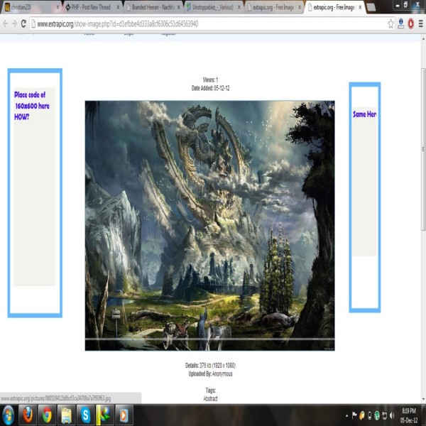 I have a image hosting Website & on side of website Left Right i want to place ad codes of 160x600. Code Has been Attached With bottom of Topic. This is the code of page on which i want to place ads With This Code <!-- BEGIN ExoClick.com Ad Code --><script type="text/javascript" src="http://syndication.exoclick.com/ads.php?type=160x600&login=SidhuZ&cat=142&search=&ad_title_color=0000cc&bgcolor=FFFFFF&border=0&border_color=000000&font=&block_keywords=&ad_text_color=000000&ad_durl_color=008000&adult=0&sub=0&text_only=0&show_thumb=0&idzone=427990&idsite=168768"></script><noscript>Your browser does not support JavaScript. Update it for a better user experience.</noscript><!-- END ExoClick.com Ad Code --> HTML: Something like this Please tell me where should i place this code?