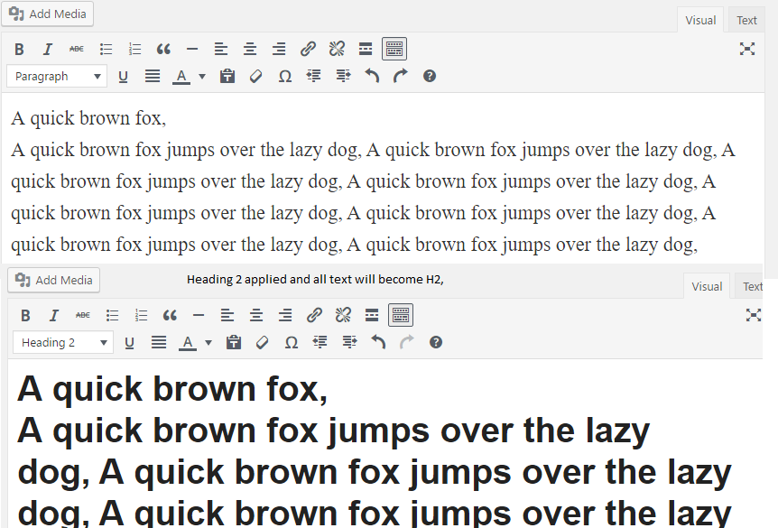 You are facing that problem because your text is not formatted. You just need clear all formatting of your text and then only possible to apply different options. Just check below image, I am trying to make heading "A quick brown fox" only but after changing to H2, whole text changed as H2 because I forgot to clear text formatting and it's spacing as well. So to make it work you just have to clear all formatting and spaces then after apply what are you trying for,
