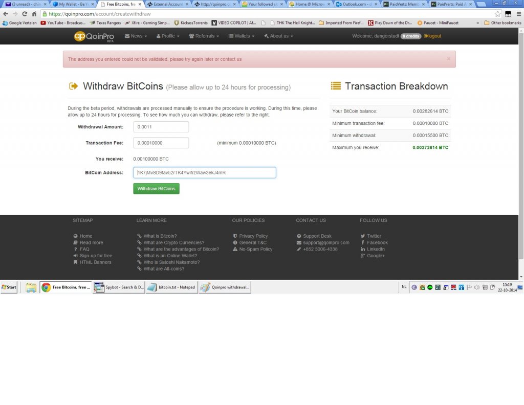 Guys, I have been using Qoinpro for about 2 weeks now. Before I always used Blockchain because that has been a solid wallet for me. As of last week I have been having troubles with incoming transactions, both Bitcoins and Dogecoins not arriving in the account, with the excuse of Authentication pending. I have sent the Authentication proof from payer to them, and in over 1 week there has been no reply whatsoever to my questions, nor have the amounts been added to my account. As of TODAY, I did a test to withdraw my Bitcoin balance, and it seems Qoinpro looks as starting to being a scam. At various times I tried various wallet accounts, including Xapo and Blockchain, and all gave the same message at any given time : "The address you entered could not be validated, please try again later or contact us". Proof Below: Of course if you can't reach the support...nothing ever happens, nothing is solved and no money is gained. So for the time being, I'm redirecting all my payments to other accounts, and you have been warned. Best regards, James Ching Chung