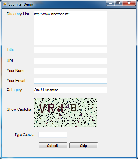 Hi im developing a small directory submitter tool. submit to "PHP Link Directory" site. but im not able to send captcha to website. so i need a demo to learn i want a demo to submit to this site http://www.albertfield.net/submit.php using httpwebrequest. NOT WEBBROWSER i need code in C# Here is screenshot for demo: again. code must in C# i will pay 30-50$ Thanks