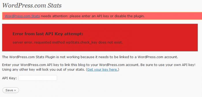 I have created a new wordpress.com account and key in the api key into my self hosted wordpress blog. Still I get this error. Error from last API Key attempt: server error. requested method wpStats.check_key does not exist.