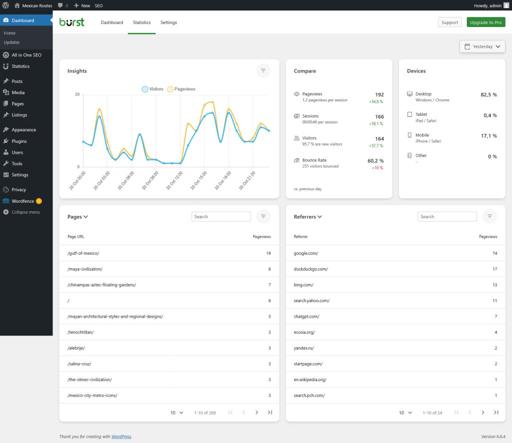 I thought the more clicks, the better. So, actually, it’s not that bad. I should take another look at GSC and see how things really look there. Anyway, I use BURST, and this plugin shows me the same thing as Google Search Console. I compared the results once, and they match 99% the same. I also check the stats with WordFence Live Traffic. Burst, WordFence Live Traffic, Google Analytics, and GSC show the same stats. I just find it more convenient to check through Burst.