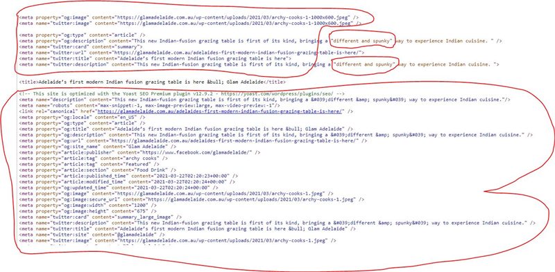 It happens but sometimes it happens because of the error code. You are using Yoast SEO plugin and it automatically ads Open Graph Tags (OG Tags) and Twitter Card to your webpage. And your website is also written these tags on the header part itself. Remove one, See the attached screenshot and don't use the multiple double quotes in the description as it terminates your description once you add the quoted text in the tag). I am not sure but try this, hope it will help you. Best Ways to use Open Graph Don't forget to define all the required Open Graph properties. Try not to exceed the og:title length over 55-60 characters. Keep your og:description under 60-65 characters. Use high-quality images for og:image, at least 1200 x 630 px, max image size 8MB. Use the Open Graph Debugger to preview your snippet, and to make sure all data is filled in. Tweak and tune it until you get it right. An added benefit is that you’ll pre-cache the snippet too, meaning that your snippet will already be shown correctly the first time it’s shared. Don't forget to use these tags og:image:width and og:image:height to enable social channels to load the image properly.