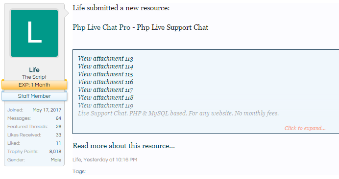 This has to be the most uninspiring forum post ever. No thumbnails of the attachments - no way of knowing what I'm clicking through to. No text to explain why I'd be interested in using the script or why you feel it's worth adding to your forum. Directories are dying, you know that right? And your forum isn't a forum, it's an unstructured directory. Lets say I was looking for a support chat script - I would just google and see what comes up. I wouldn't come to your site to see what you recommend because I have no idea (based on this example) if you are recommending it or just letting me know that it exists. Google's SERPs at least give me some idea about the quality of the site they're showing me. here you do give info but it looks to me like a scrape from the original site rather than a considered review and recommendation On the home page the tags let users know what they're looking at but there's guide about what the different coloured Ls stand for. oh and finally, wtf is the Real Madrid item doing in there?