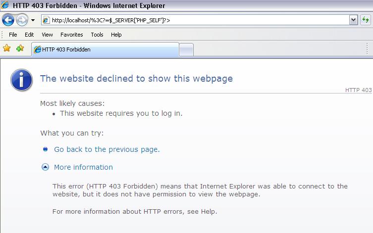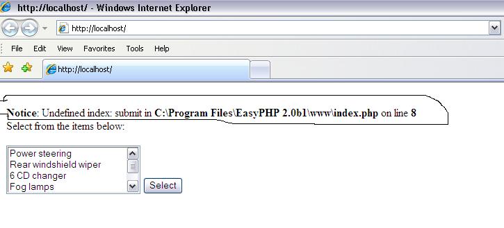 when i run index.php in localhost giving below error : Notice: Undefined index: submit in C:\Program Files\EasyPHP 2.0b1\www\index.php on line 8 when i click on button "select" also giving error about authorization i have attached the error screens as jpg files. <html> <head> </head> <body> <?php if (!$_POST['submit']) { ?> Select from the items below: <br /> <form action="<?=$_SERVER['PHP_SELF']?>" method="POST"> <select name="options[]" multiple> <option value="power steering">Power steering</option> <option value="rear wiper">Rear windshield wiper</option> <option value="cd changer">6 CD changer</option> <option value="fog lamps">Fog lamps</option> <option value="central locking">Central locking</option> <option value="onboard navigation">Computer-based navigation</option> </select> <input type="submit" name="submit" value="Select"> </form> <?php } else { if (is_array($_POST['options'])) { echo 'Here is your selection: <br />'; foreach ($_POST['options'] as $o) { echo "<i>$o</i><br />"; } } else { echo 'Nothing selected'; } } ?> </body> </html> warm regards, mk.