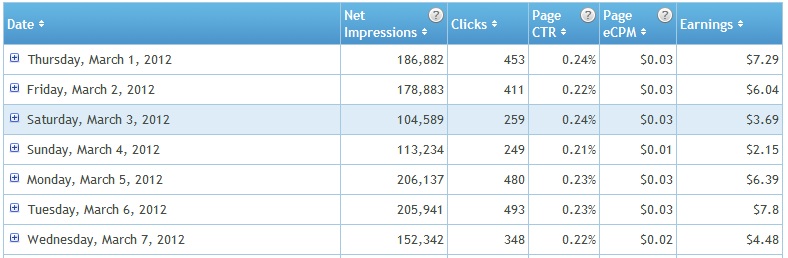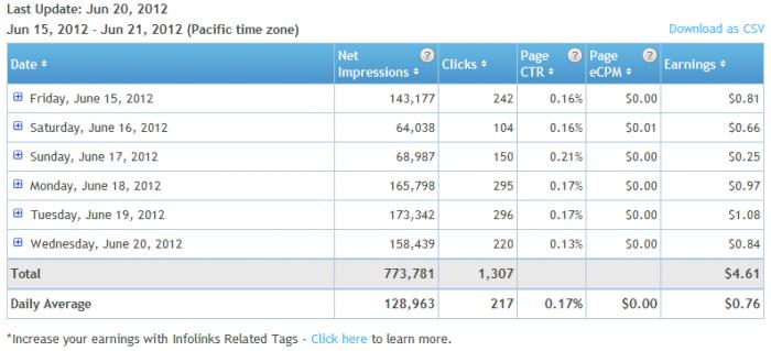 I have huge experience with infolinks, before April 2012 they were giving good rate. But now a days they are giving extremely horrible rate. Please see the screen shots below: This is my recent earning. See the earning from March 1-March 7 below: So i will remove infolinks ads very soon, they pay timely, but their rates are too much low. I need to find out another good cpm or cpc ad networks. Is there any idea for best cpc banner networks except adsense?