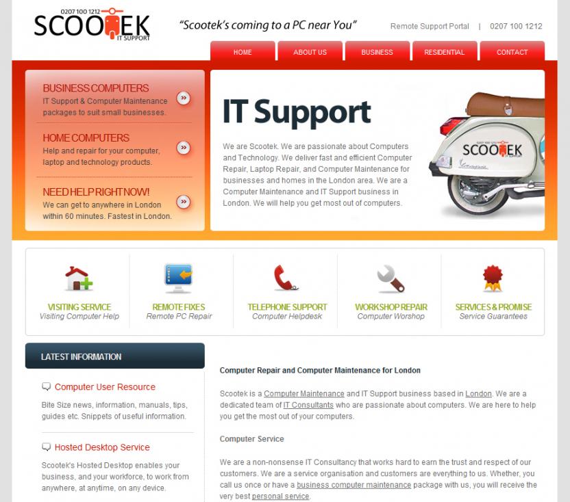 Thanks Guys. Yes, the name comes from the merger of the words Scooter and Technology, Scootek. Maggie2009, you are right, we are all on Scooters to provide rapid response computer support. I personally like the logo and I wanted make something different from the thousands of sites with computer images splashed all over. That's why I wrote in big bold letters "IT Support" so unless they were extremley blind or spent less than 5 seconds on the site, then they won't miss it. I like the logo. Maybe I am wrong, but the name and logo is short sweet and memorable. However, I will try and change the big image to one of a computer. So that it hit's the person landing on the site that it is about computers. Sometimes I hate following the herd, I suppose, it's also sometimes necessary. Thank you for you feedback.