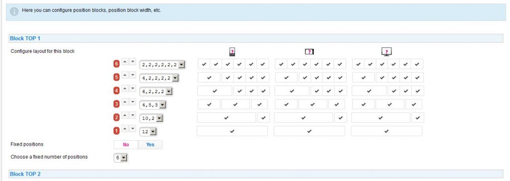 * you have 6 Column 6 Row each box is for one module's area. you can decrease or increase it . * mobile , tablet , Pc, you can disable or enable each module's area for this screens * fixed positons: yes: fixed Width no: responsive Width if you cant work with this theme you can use "Afterburner 2" Afterburner 2 is free , fast & profesional theme for joomla