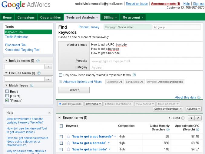 I'm trying to make some sense out of the CPC and Volume numbers that Google's new Keyword tool brings back. The image I've attached from the Keyword Tool shows only 28 searches a month for the phrase-matched "how to get a upc barcode". Yet the CPC is a very high $7.40. If I take out upc and enter a phrase-matched "how to get a barcode" the search volume goes up to 880 and the CPC goes down to $3.76. And then if I just use the less common spelling "bar code" instead of barcode, the search volume goes down to 140 a month and the CPC goes up to $4.37. There's no quality difference I can see in any of these keywords since virtually all bar codes of any interest are upc and "barcode" and "bar code" are just spelling variations. So how is Google calculating the wildly different CPC rates? It doesn't seem that the people who are buying these keywords are doing anything special with the extra detail in the keywords. The visitors are just being dropped on the company's main landing page, the same as if the searcher had entered "barcodes" which has a much lower CPC: $2.48. Why would Google think these keywords are worth that much and why would anyone pay it? Thanks for any insights.