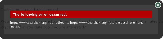 http://www.searchuk.org/ is a redirect to http://www.searchuk.org/ (use the destination URL instead).