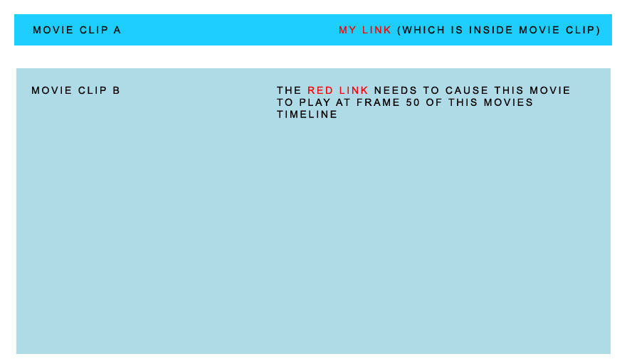 Hi, I am using ActionScript 3.0 I was wandering if it is possible to link from a frame inside "movie clip A" to a frame inside "movie clip B"? Both movie clips are on the main timeline. If you know how to do this, or don't know how to do it but know that it is possible, let me know. Thanks in advance. I just uploaded a pic to help explain