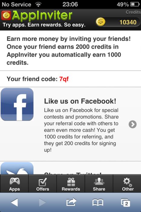Hey guys, Just found this super easy way to make money on your iPhone or iPad (goto www.appinviter.com on your phone) so thought I'd share. I already made $50 Amazon Giftcard within a day pretty easily. So you can make money by downloading apps, watching video trailers and trying out relevant offers. If you refer friends, both you and your friends make money too. I referred a few of my friends and they paid me out $1.00 for each friend that signed up. Sign Up with my referral code please : http://www.appinviter.com/i/7qf Enter this code 7qf to get 200 points for free. Install Instructions - Easy as a Pea: 1. Click this link on your iOS device (iPad or iPhone) to install: AppInviter 2. Save the Link on your Home Screen (so you don't forget to make money every day!) 3. Open AppInviter on your HomeScreen 4. Once AppInviter is opened, click on 'SHARE' at the bottom of the screen on your iOS device 5. Then click 'ENTER REFERRAL CODE'. A pop-up message will ask you to install the application, Press Install. 6. Check that you received the 200 Points ALL FREE. If you didn't, enter this code 7QF 7. Then comes the money part! Start downloading the apps, watching videos and trying out offers to get paid!