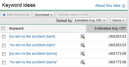 Could this be the most expensive AdWords keyword in the UK? no win no fee accident claim http://twitpic.com/1r7jue Any advance on £203.03 CPC!!!