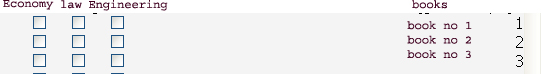 Hi I have form like this at attachment , the problem i want to choose two or more choise for each book for example(book1--> economy and law) type of books from database table ,and books at another table i want to have these results 1---->law-Engineering 2---->law-Engineering-Economy