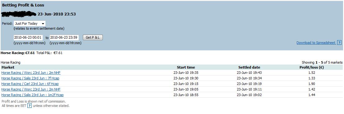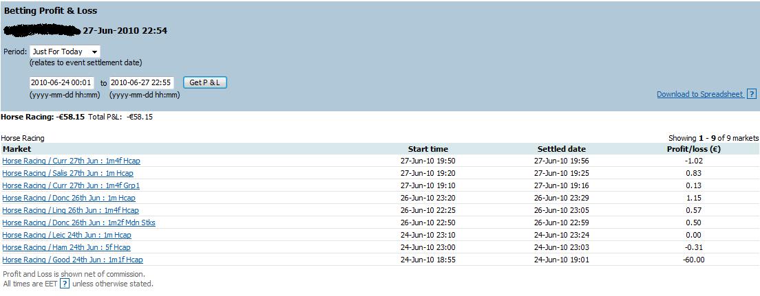 24-27/06 - 58.15 € Total 43.55 € Profit -56.45 € I was in a hurry on thursday and thought that I could do 1 quick trade, so I didnt view charts and just placed trade and it didnt get matched pre-race and then I let it go in-play and what do you now, few mins later I lost 60€, actually it wasnt trade as much it was pure bet but I've build myself up and start trading with positive mind tomorrow, as long as I dont blew my whole account I have hope. Just have to train myself to stop doing these stupid moves and accept small loss instead of big one. Just read one traders blog and he had 282k £ in hes betfair account and his goal for 1 month period was to make 18k £ profit and thats about 6% in 1 month, so I started to think that maybe I have too big goals if I try to make 15% in a 1 single day. but its mostly because playing with small capital you would need so much profit that it would feel good.