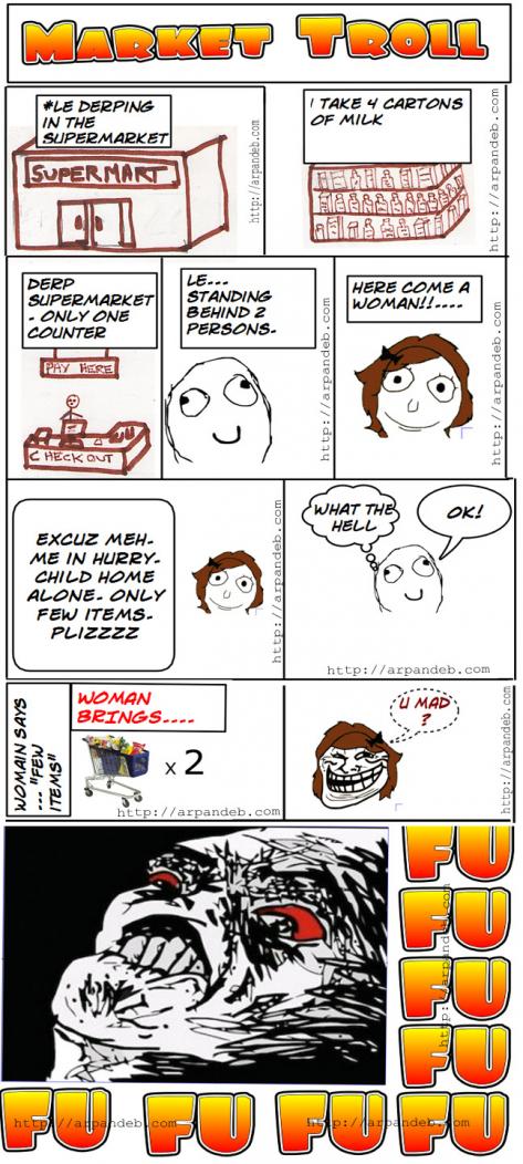 I think most of us have seen those funny memes called rage comics. The comics depict real life or near real life situation or ideas that are frustrating and make you angry but still are funny. Yesterday, I met a troll in a store, who wasted my time and turned me into a Rage-o-saurus Here is the comic. Note rage comics are not known for their graphic prowess.